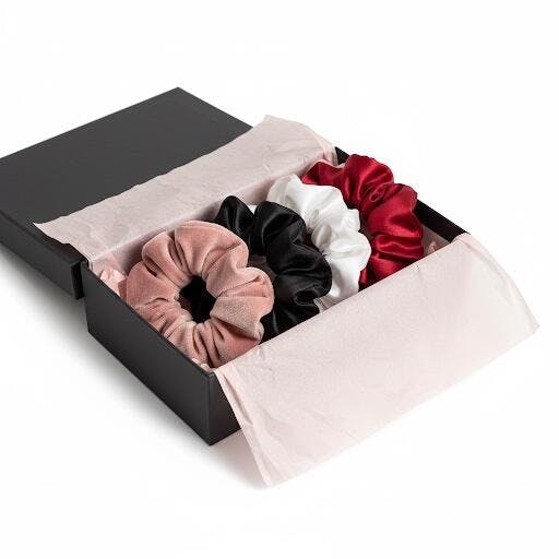 Each order arrives in a beautiful black delivery box with elegantly layered tissue material that showcases your scrunchies perfectly. Make it extra special by adding a custom message in the personalization field at checkout - perfect for Valentine's Day gifts, Valentine's surprises, or romantic gestures!